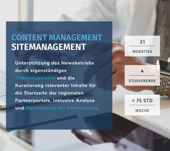 WIE? Unser Team unterstützte den Newsbetrieb durch das Content- und Sitemanagement der Startseiten der regionalen Partnerportale. Die Studierenden übernahmen die eigenständige Pflege und Kuratierung der Inhalte basierend auf der tagesaktuellen Relevanz.