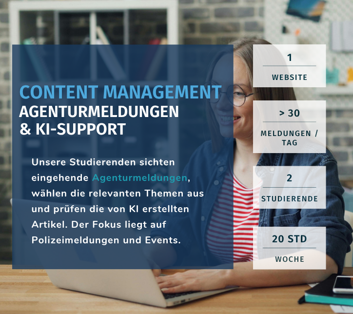 WIE? Unsere Studierenden erhalten von der KI erstellte Artikel und Meldungen, prüfen diese vor der Veröffentlichung nach den Vorgaben der Redaktion und passen sie bei Bedarf an.