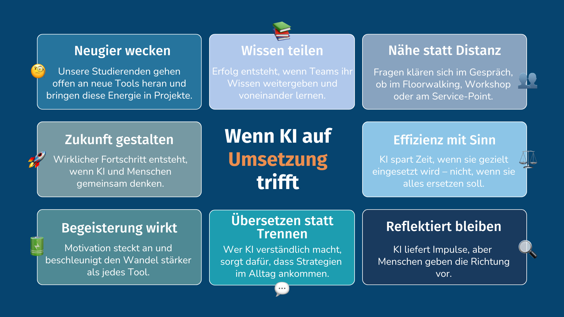 Im ersten Teil unserer Blogreihe haben wir beschrieben, warum wir uns entschieden haben, den KI-Wandel nicht länger aufzuschieben, sondern unsere Organisation bewusst neu auszurichten. In diesem zweiten Teil geht es nun um diejenigen, die diesen Wandel tagtäglich lebendig machen: unsere Studierenden.